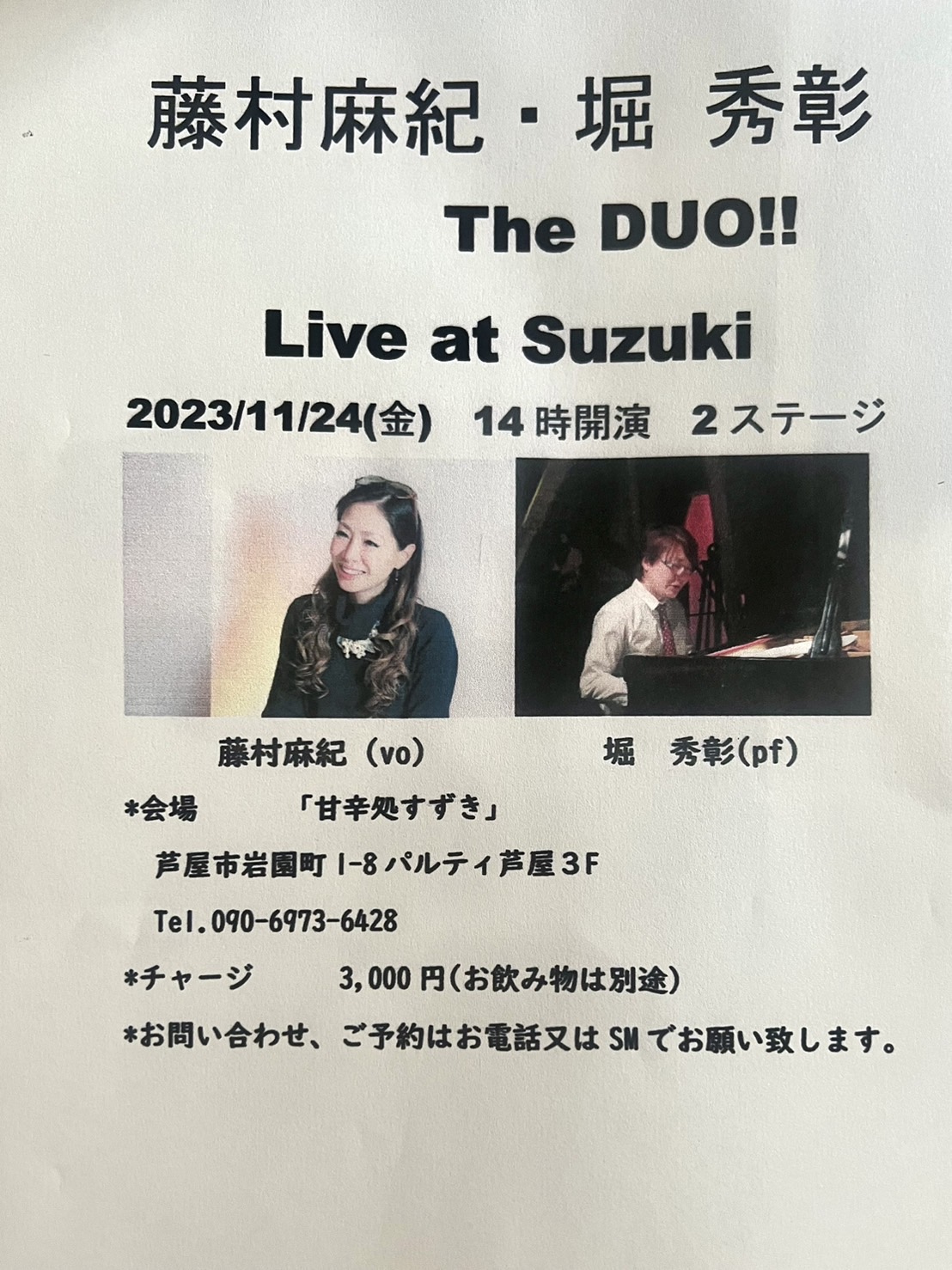 藤村麻紀(V) 堀秀彰(P) 14:00~ 15:30〜 ミュージックチャージ 3,000円(+飲み物は別途) 〒659-0013 兵庫県芦屋市岩園町1−8 電話: 0797-38-2424 携帯:090-6973-6428 お申し込みはお電話またはショートメッセージでお願い致します。