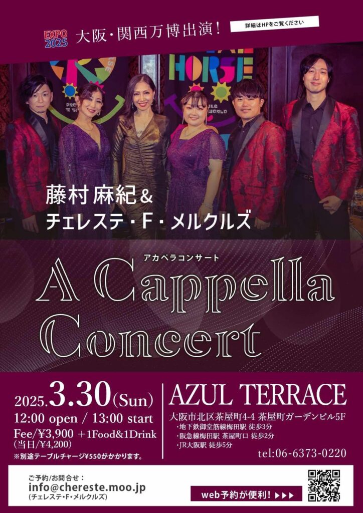 藤村麻紀&チェレステ・F・メルクルズ アカペラライブ[みさき、ひろこ、ゆうすけ、かずみ、せいじ] OPEN12:00 START13:00 予約:¥3,900/当日:¥4,200 TC¥550+1Drink&1Food ※税込 EXPO2025 大阪・関西万博に出演する藤村麻紀&チェレステ・F・メルクルズが万博前にここAzul Terraceに登場!